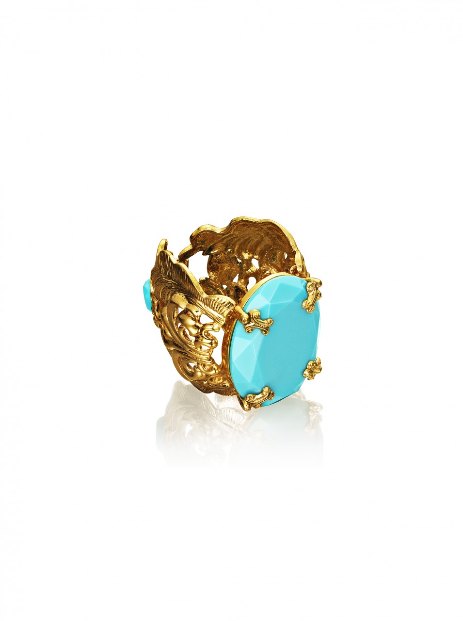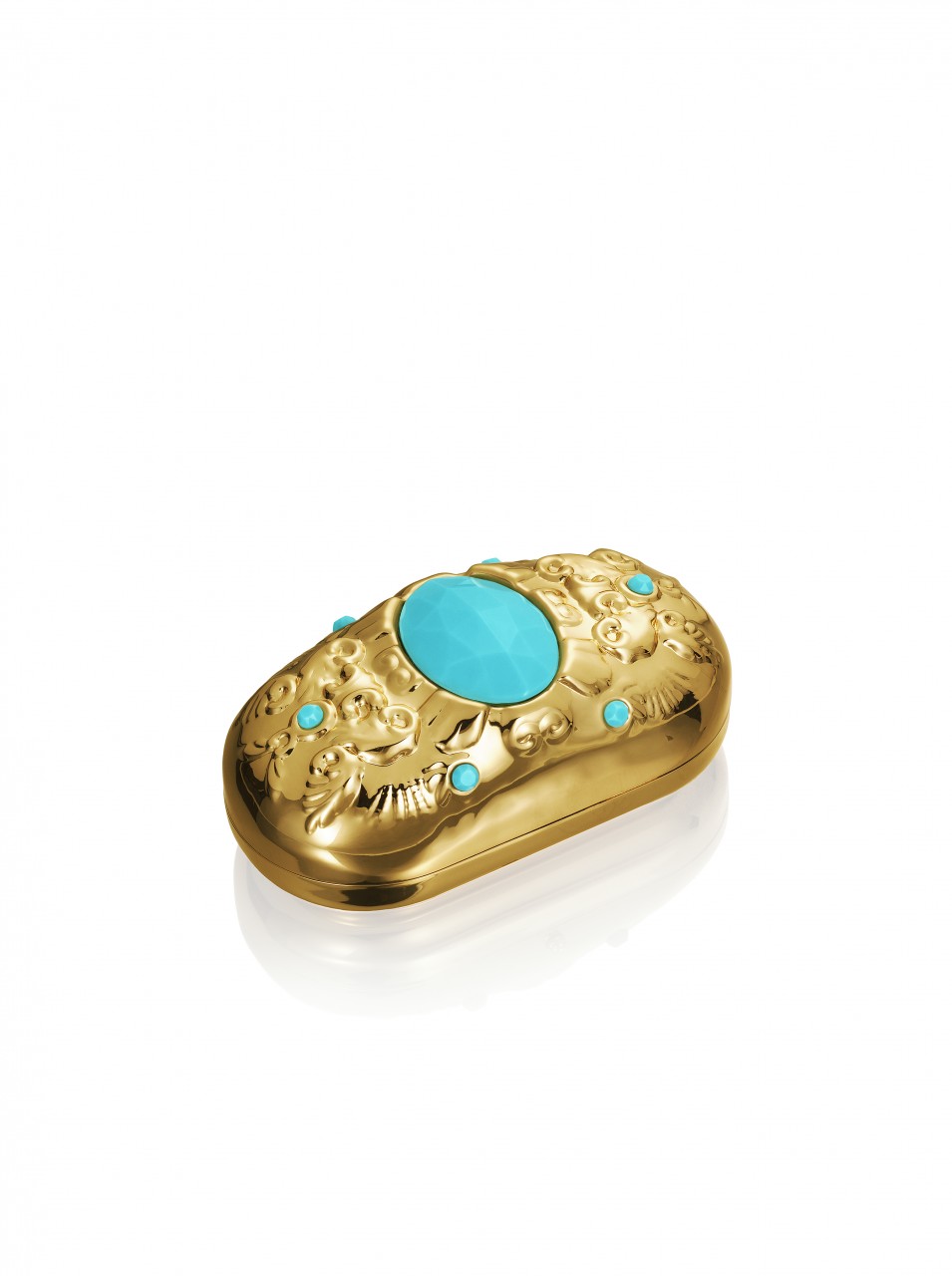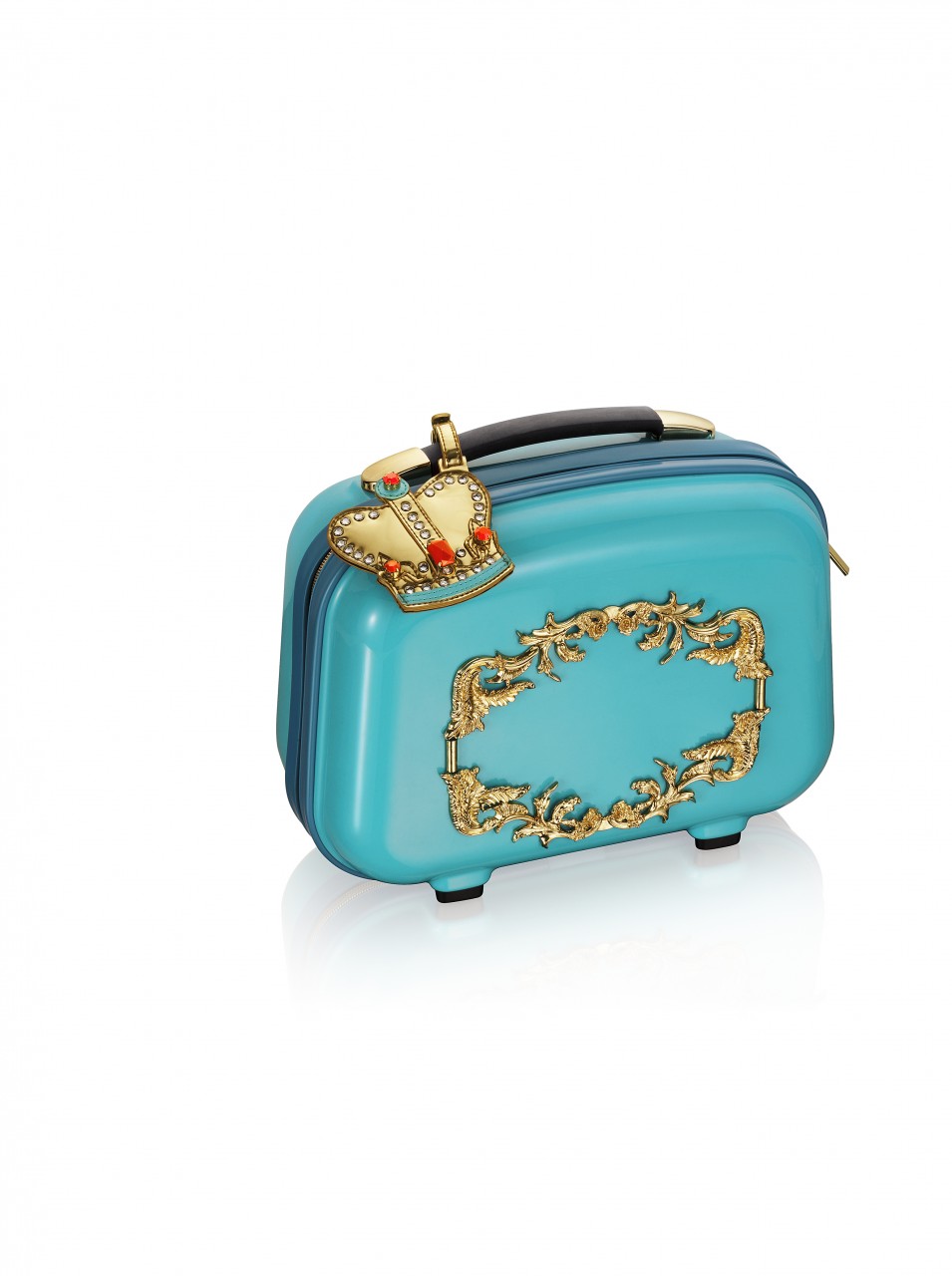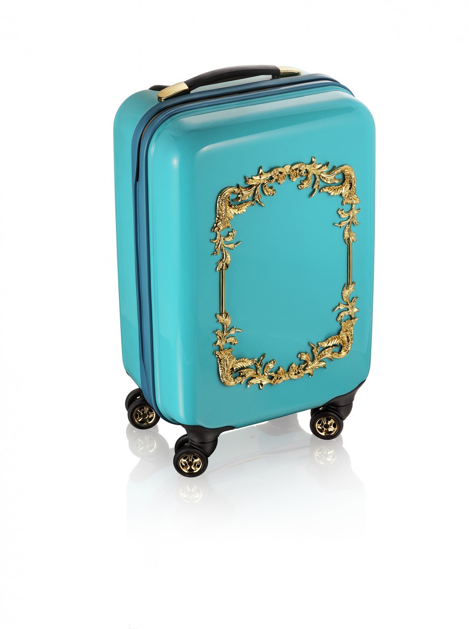 The collection features jewelry, sunglasses, accessories and shoes. In reflection of Anna Dello Russo’s playful nature, she has also created a special suitcase, a turquoise trolley with gold motifs designed to recreate the excitement for Fashion Week tours.