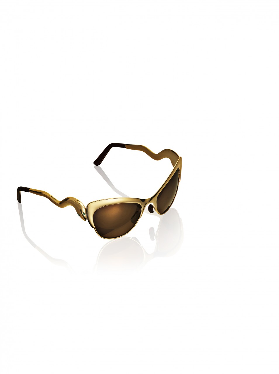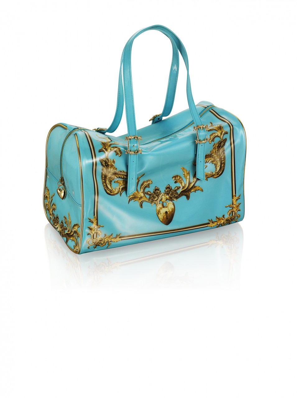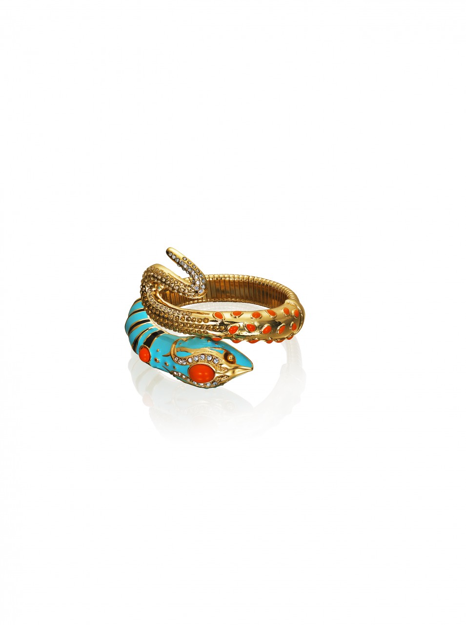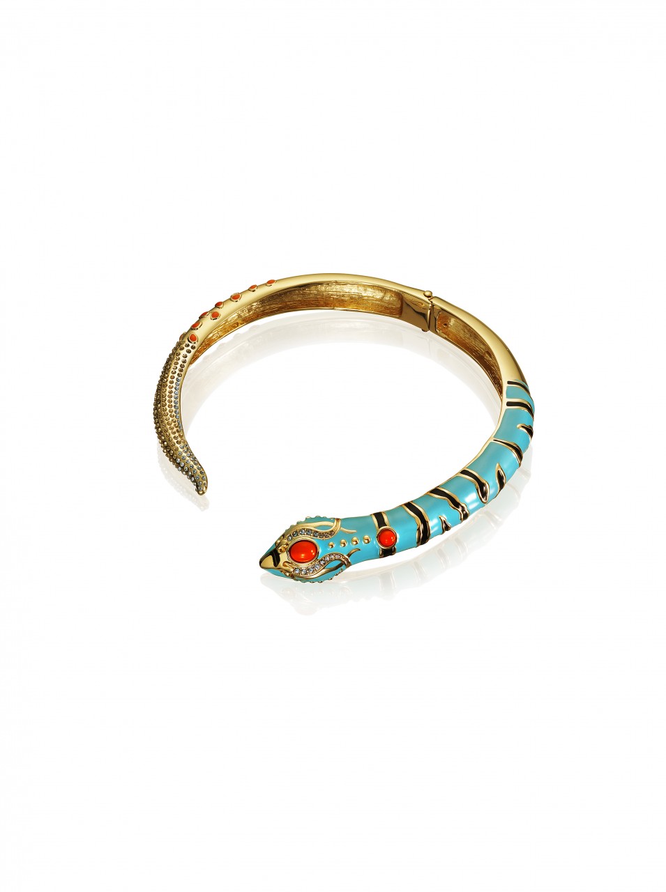 The collection features jewelry, sunglasses, accessories and shoes. In reflection of Anna Dello Russo’s playful nature, she has also created a special suitcase, a turquoise trolley with gold motifs designed to recreate the excitement for Fashion Week tours.