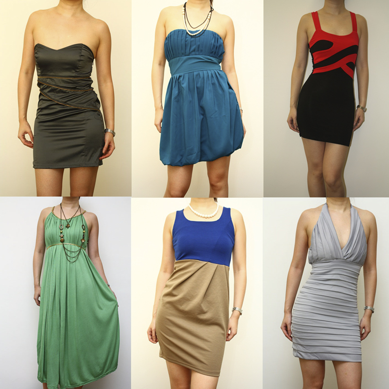 Rugged Satin Tube Dress at RM35, Padded Chiffon Bubble Dress RM40, Retro Bodycon Dress at RM35, Versatile Grecian Maxi at RM40, Two-tone Working Dress RM45, Halter Neck Panel Dress RM35