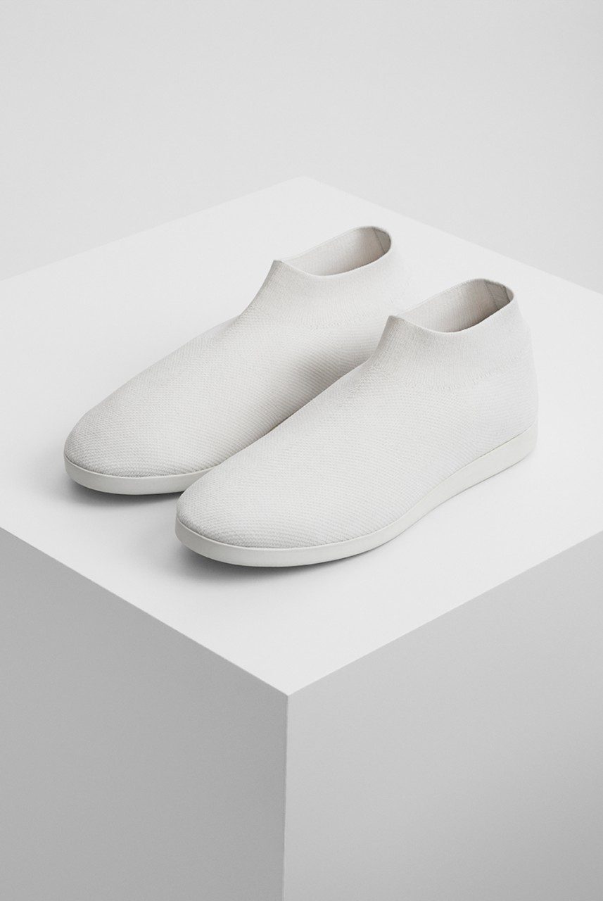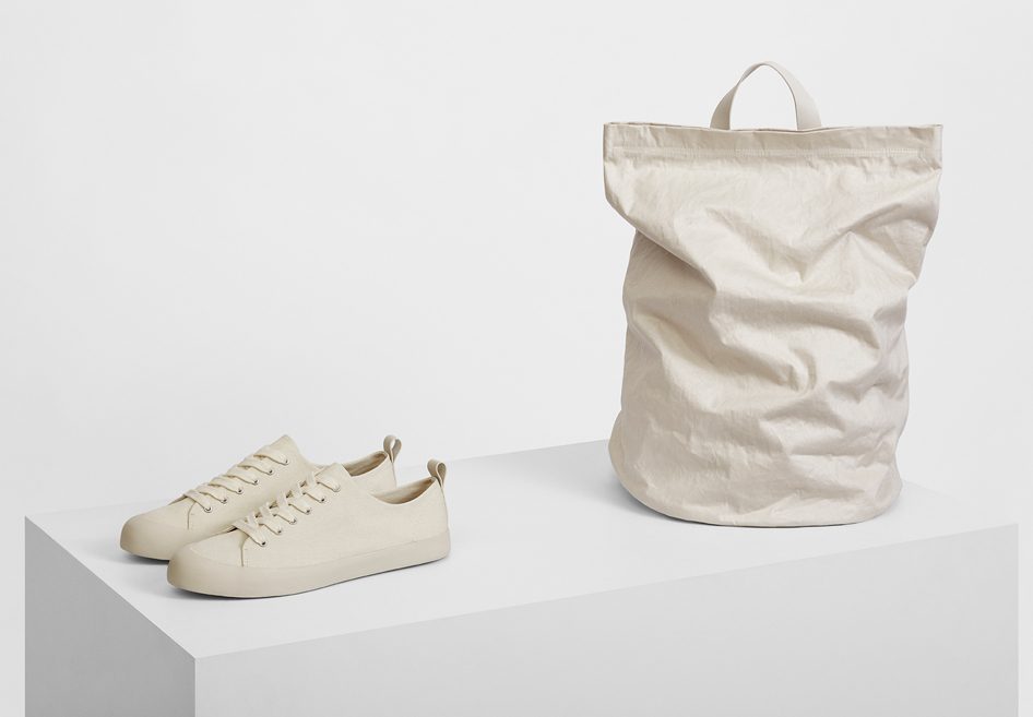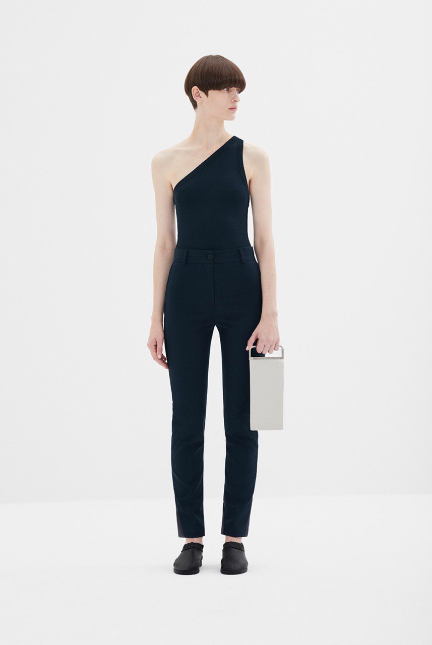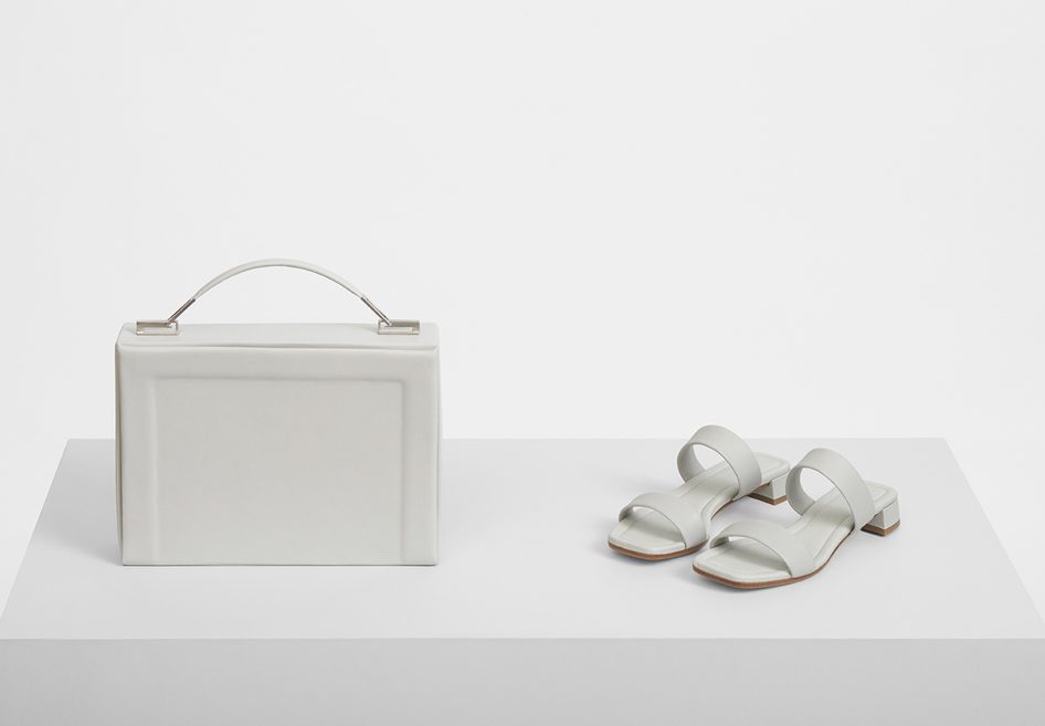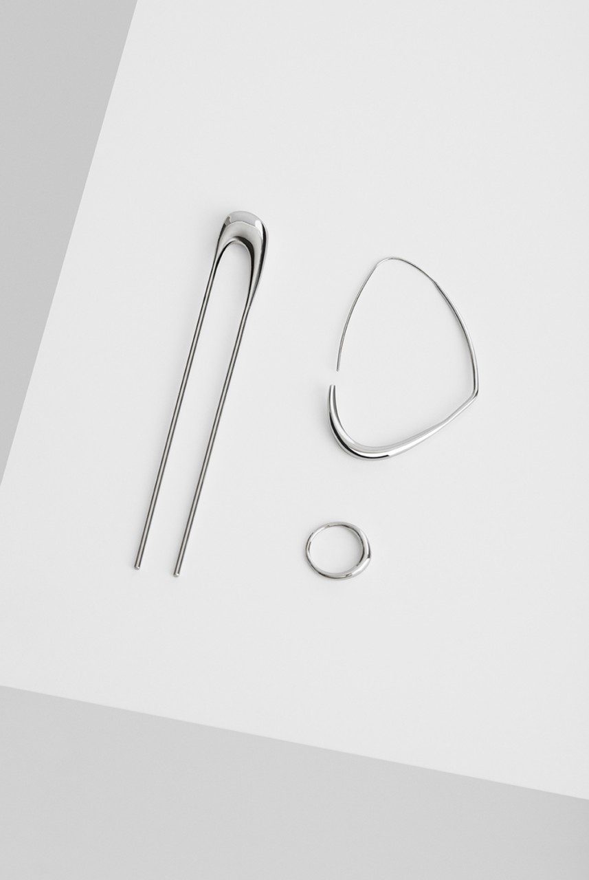 A sneaker is curated with fly-knit (proposing a new area of wearability) and silver jewellery is fluid, creating floating forms. Ties are introduced to both men’s and women’s wear adding detail which disappears into the silhouette. Eclectic elements come together to create accessories; the shopper bag is proposed in ivory patent leather, the clutch is elongated with a brushed metal handle and the rectangular leather handbag comes with a technical handle.
