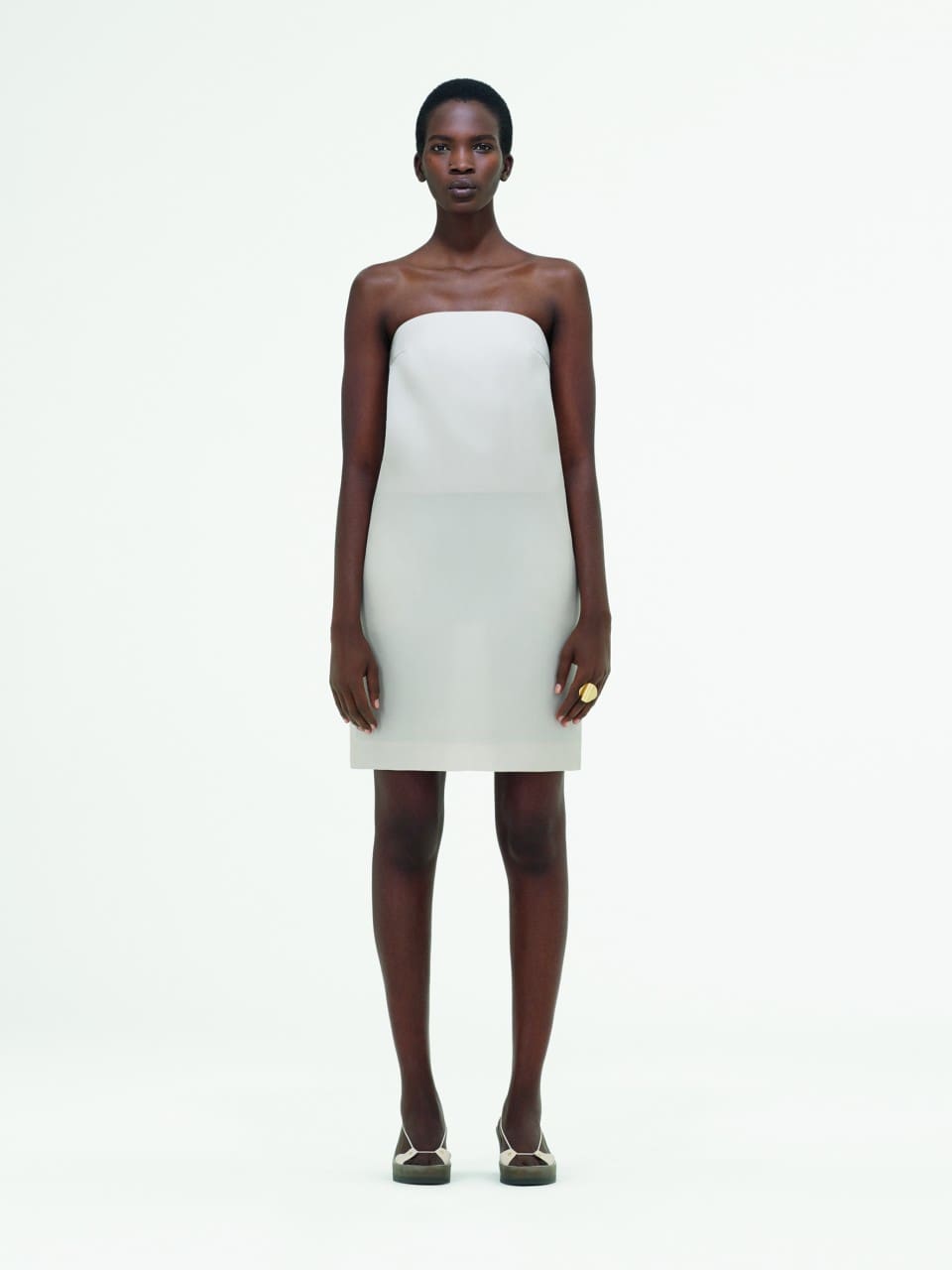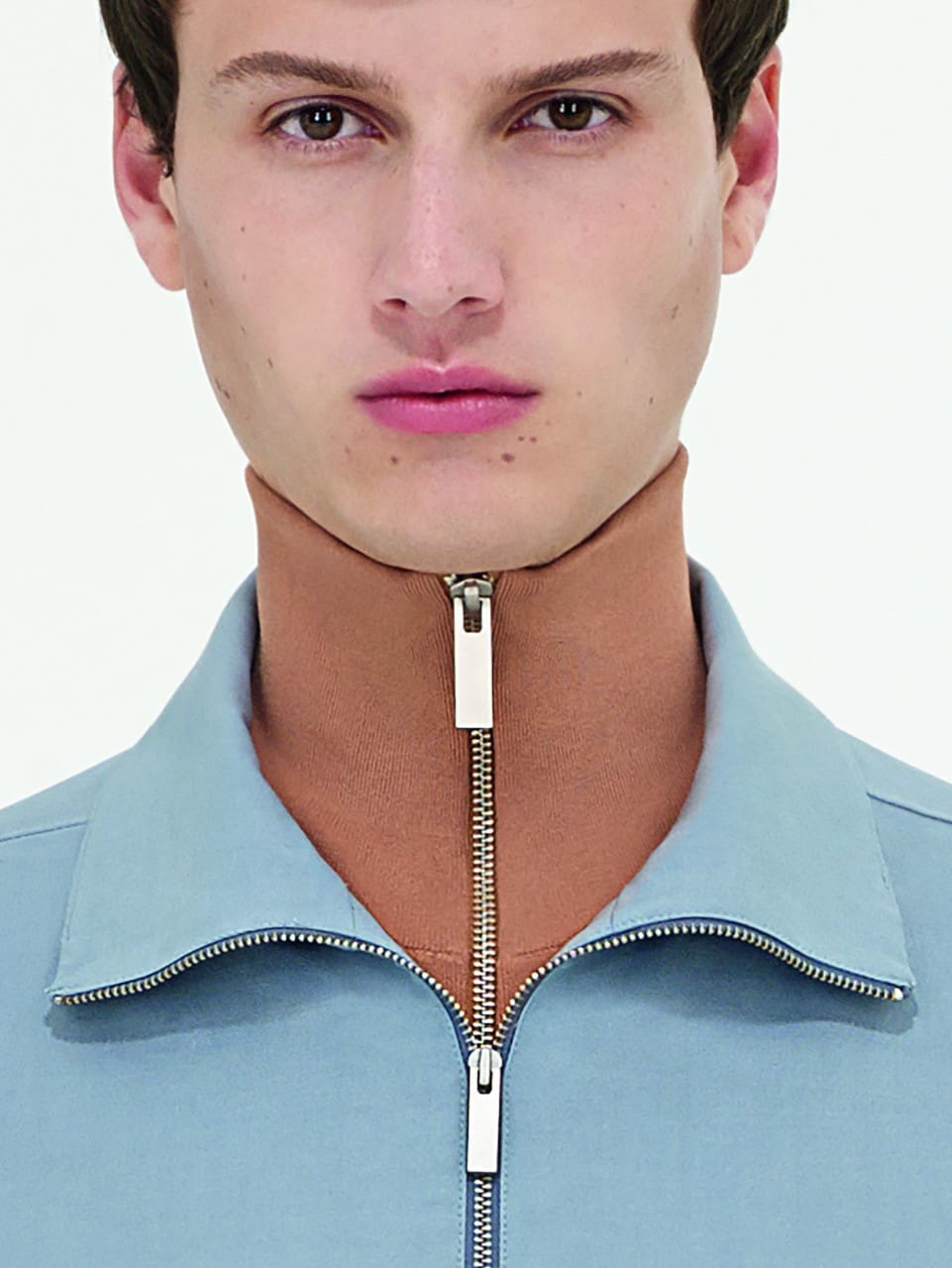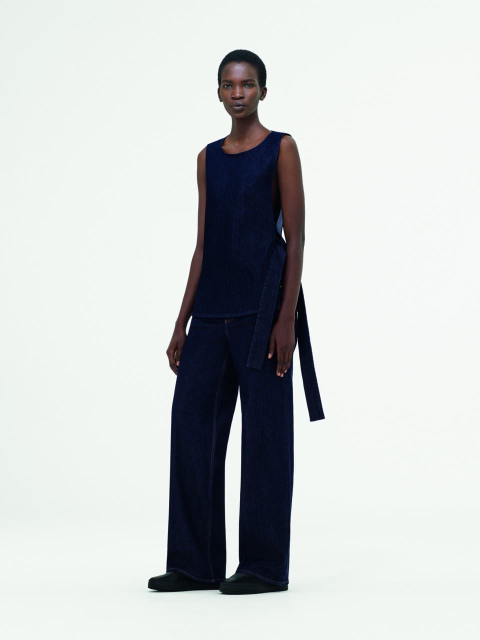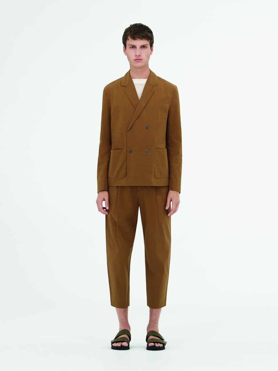 For women, the two-piece gets an update this season. A cotton poplin top with a detachable apron is paired alongside a straight-leg trouser whilst a voluminous bomber cotton silk jacket with elasticated detail is accompanied by steel blue wide-leg trousers. Playful effortlessness is seen with the drawstring fisherman trouser placed next to a voluminous shirt with an updated neckline.