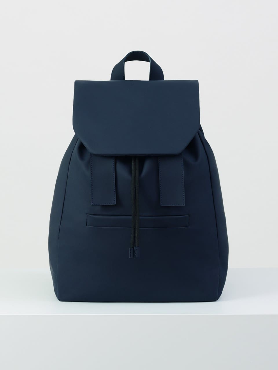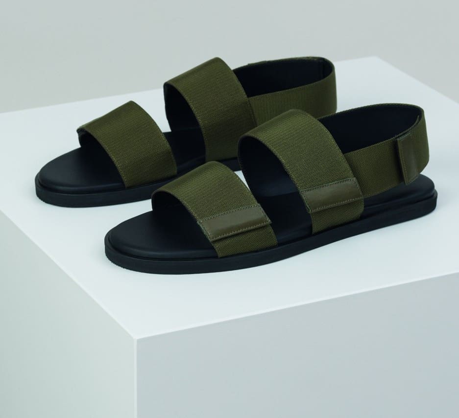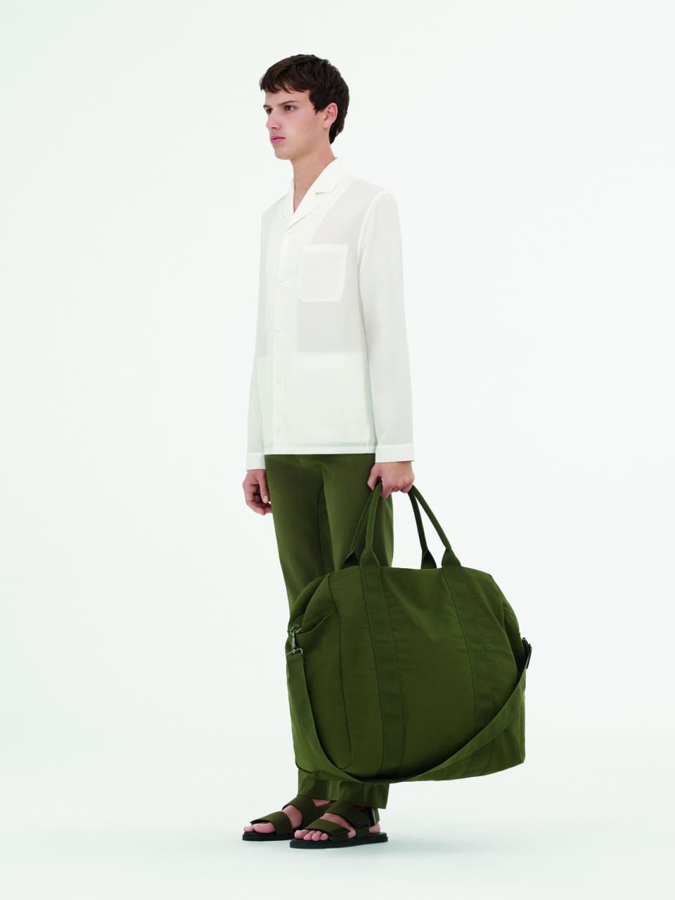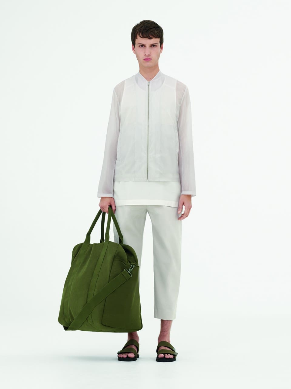 For his accessories, a khaki green sandal features technical webbing contrasted with a sand nubuck leather in a one-piece lace up sneaker. Like the foldable leather bag, the key item this season is the rubberised leather backpack with a velcro fastening.
