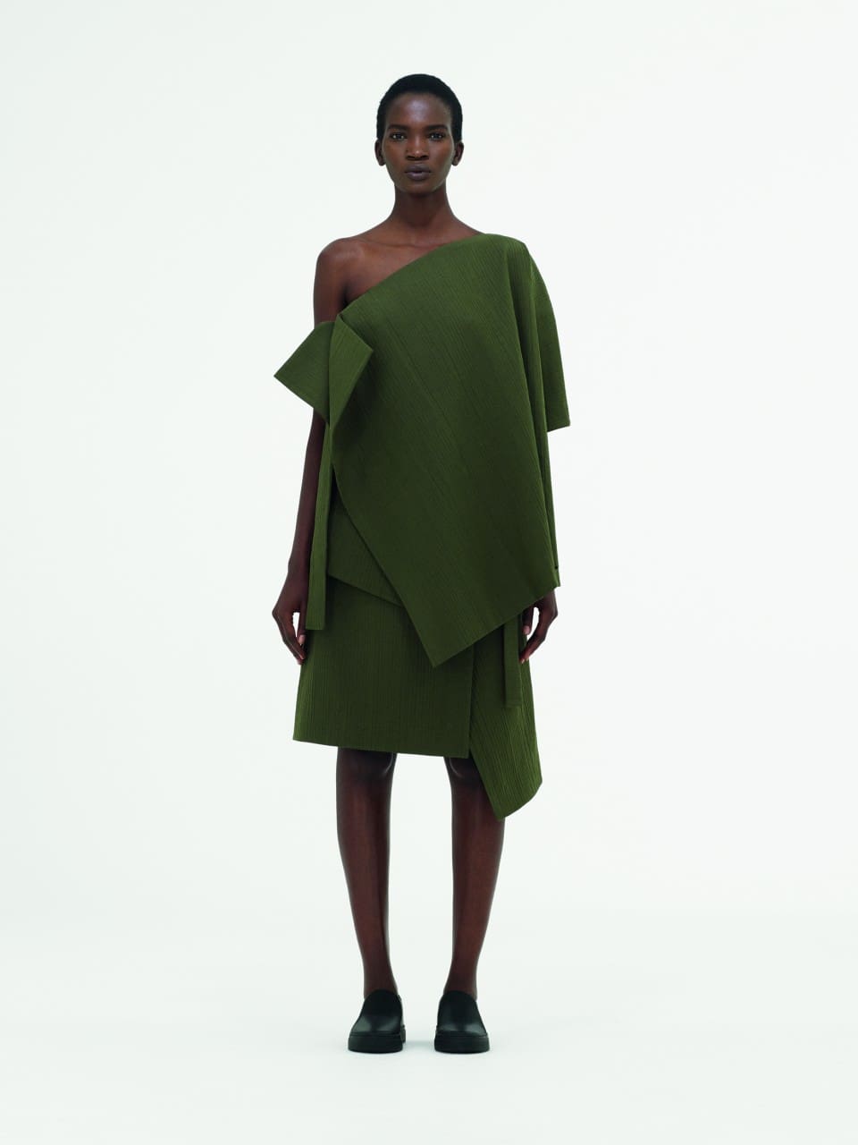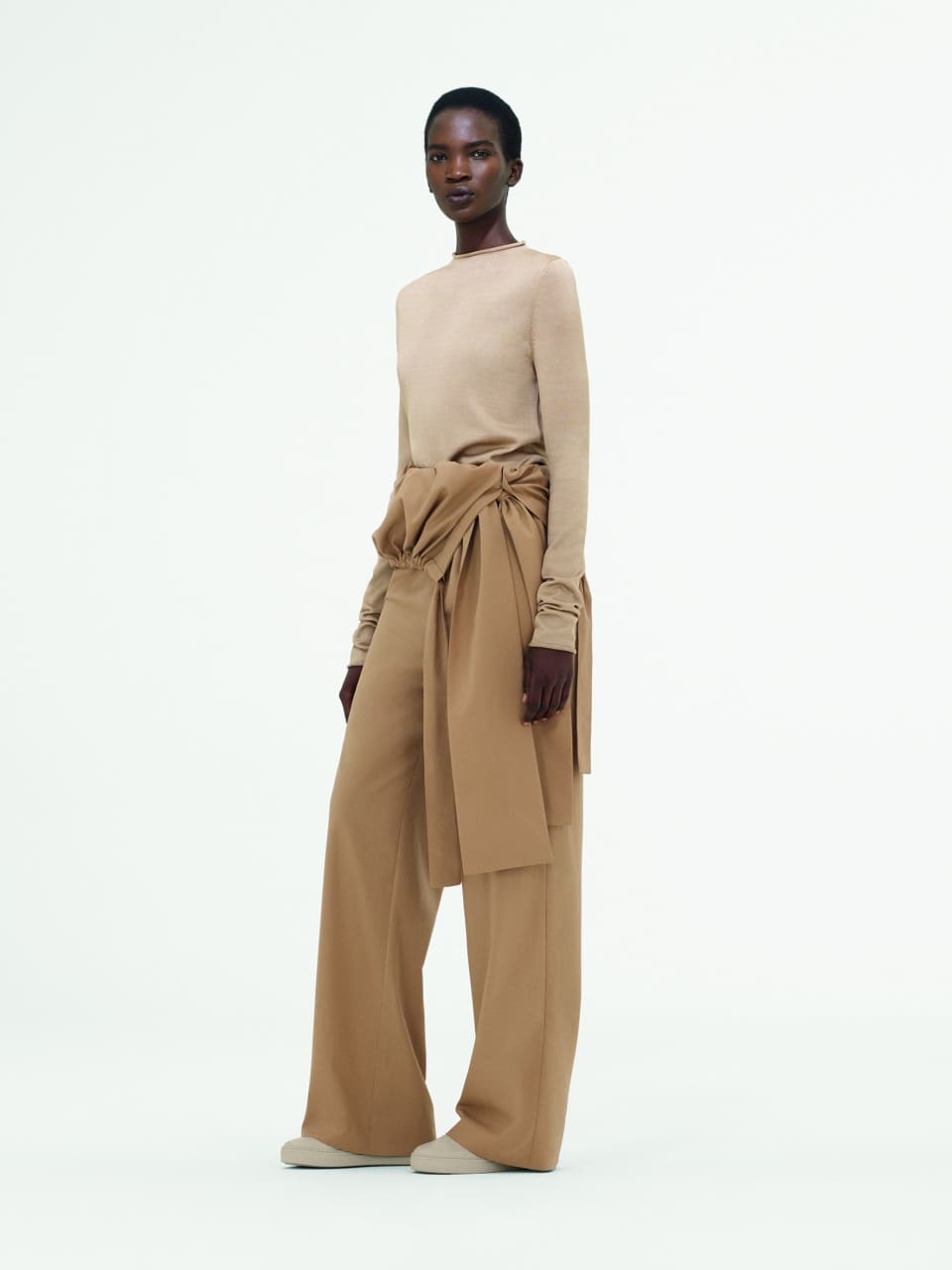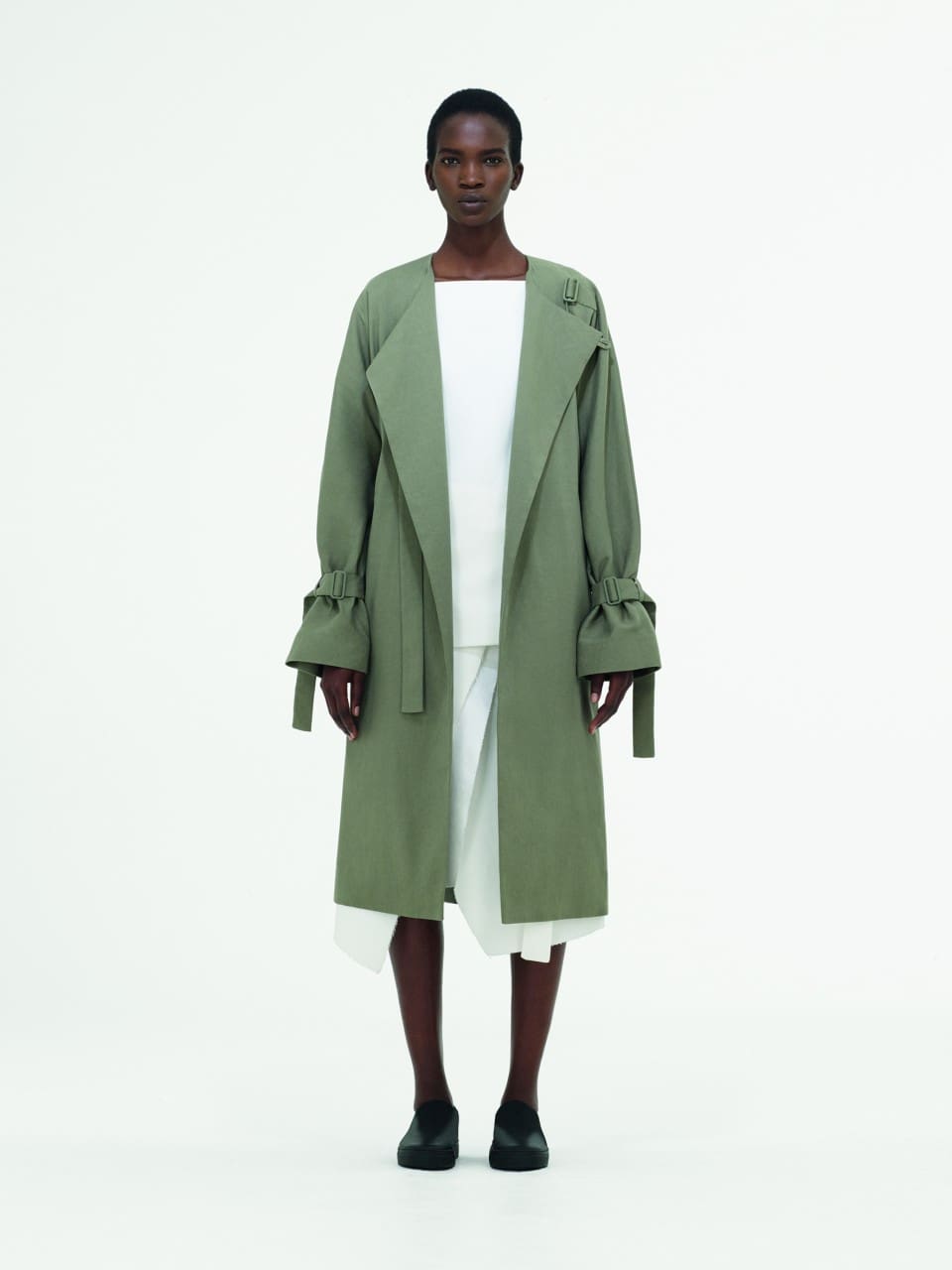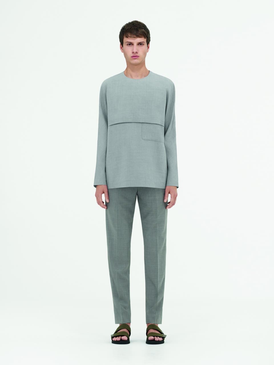 A mid-ankle cropped trouser and oversized short sleeved woven t-shirt in navy supplies an updated modern ease while a cropped light weight wool trouser is placed with a quilted cotton jacket and elongated high-twist cotton jersey top – all in light sage, where a modern take on a tailored look with drapes and volume is discreet yet distinguished.