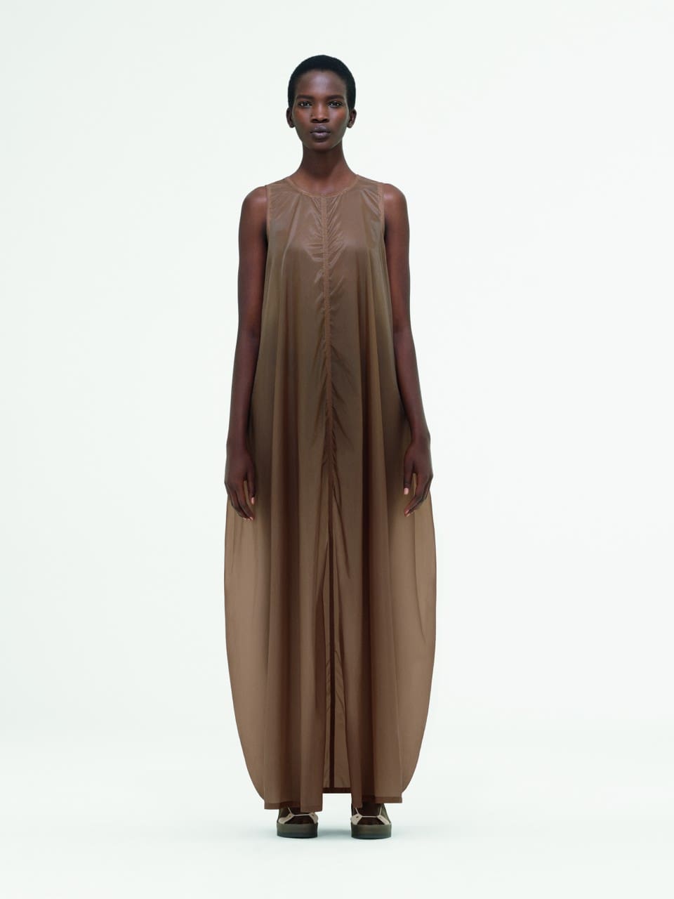 Cotton silks and finely textured fabrics takes center stage, confirming a romantic and nostalgic feel. Concave and convex method forms effortless silhouettes with the support of technical and natural fabrics. A semi-transparent nylon reinforces the idea of an airy, unpredictable state – reminiscent of a voluminous parachute.