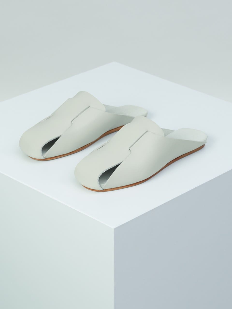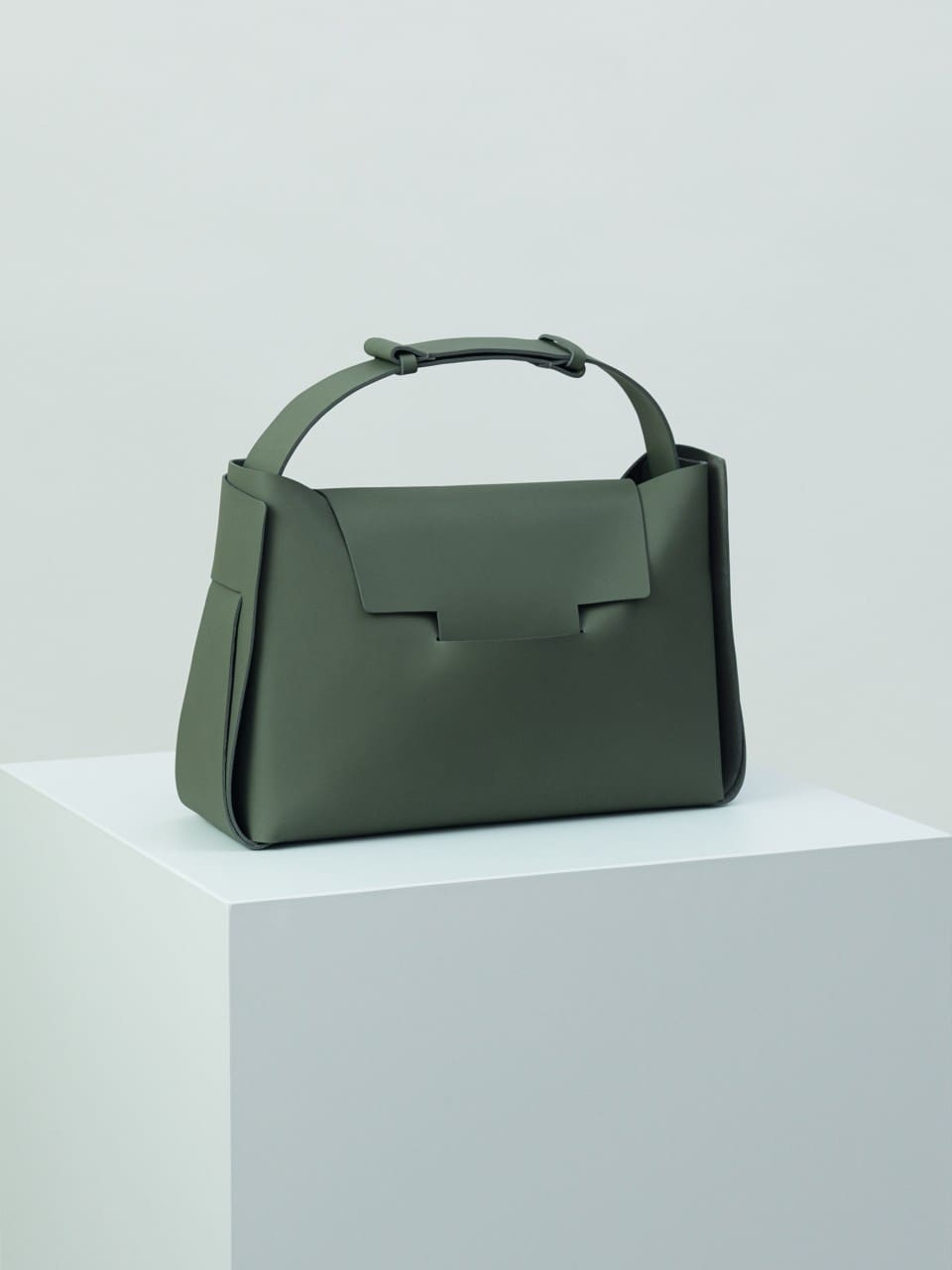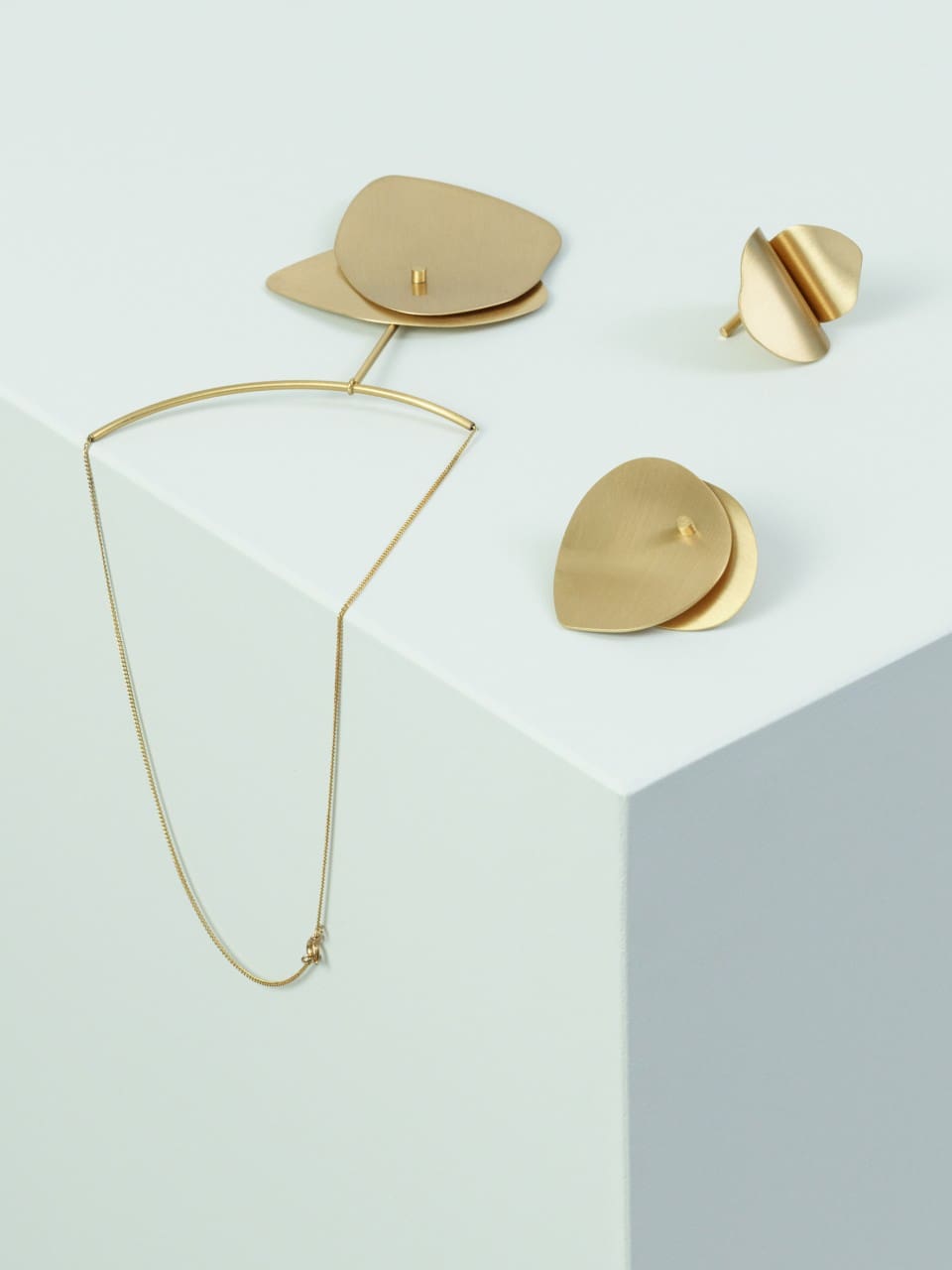 A gold plated amorphous shape jewellery set includes a bar ring, earrings and necklace is rapidly making its way on our favourite list. A folded leather shoulder bag in dark sage in a rubberised texture also compliments the collection while the leather sneakers and sandals feature elastic fastenings.