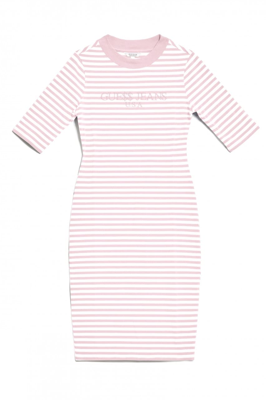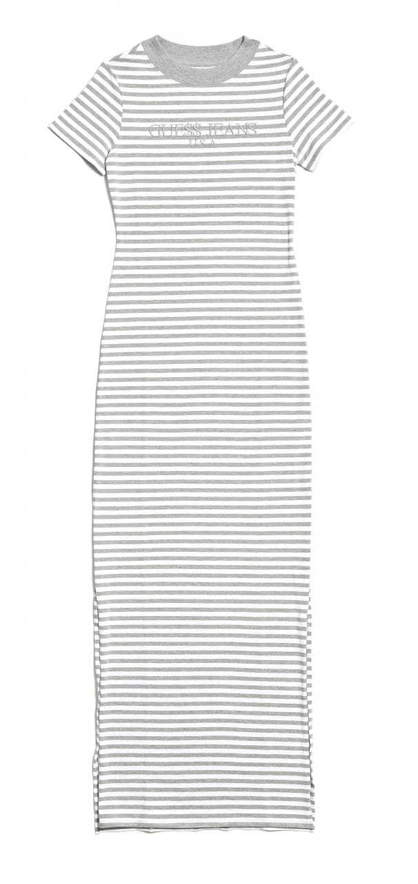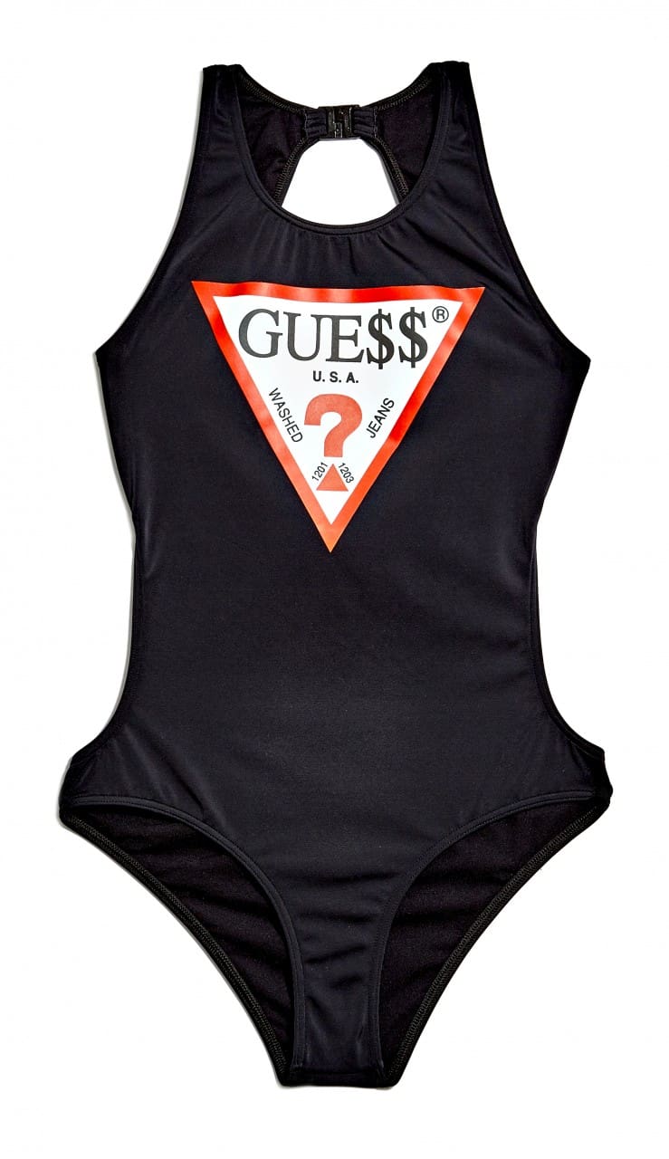 GUE$$ logo-mania tees make a scene on mock-neck shirts, short-sleeved maxis and half-sleeve dresses as well and oversized retro tees. Swimwear gets an upgrade in the form of one-piece black and white bathing suits stamped with the notable GUE$$ triangle logo accompanied by an array of two-piece triangle and push-up bikinis splashed with striped patterns and solid pastels.