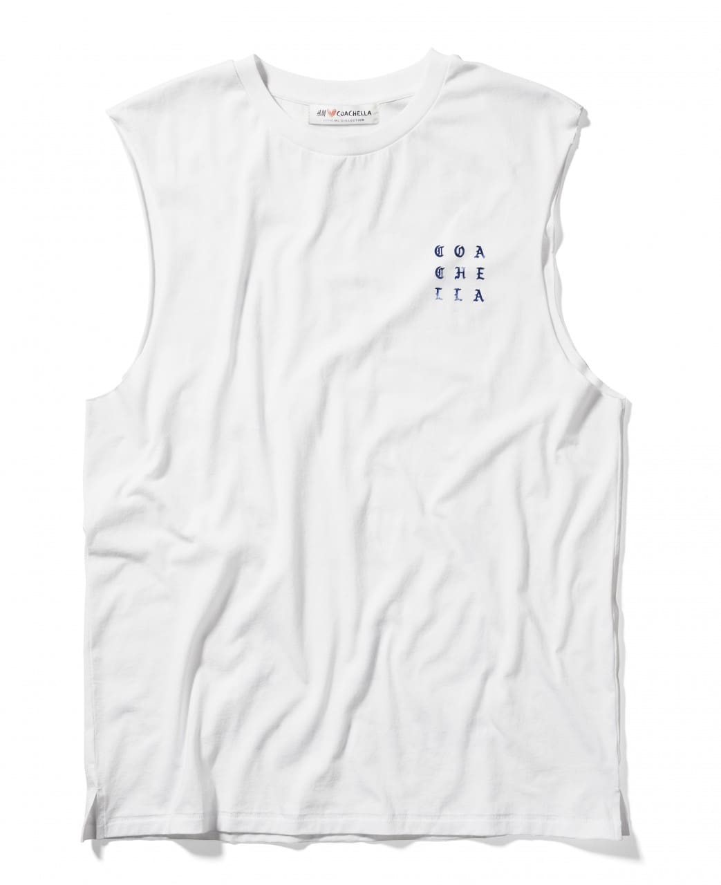 For the ultimate festival style, there’s the essential hoodie and also a metallic anorak, plus a black body suit with an open-laced back. For men, it’s all about the perfect tie-dye T-shirt with matching tie-dye drawstring shorts. A white cotton tank has gothic Coachella graphics on the back and the cut- off denim shorts has biker details at the knee, for a touch of edge to the Coachella mix.