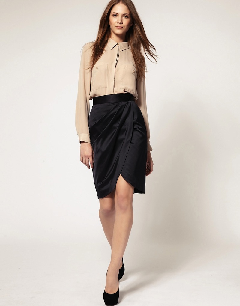 Get the classic modern office look by pairing pencil skirt with a soft, flowy top with frills or a pussy bow. It’ll draw attention from your curves down south up towards your neckline. Try not to go too loose at the top or else you’ll just look frumpy.