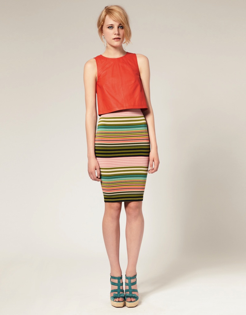Take fun to a whole new level by pairing cute little crop tops with funky colored skirts like this! If you’re worried about looking too casual, pull on a cardigan or a blazer.