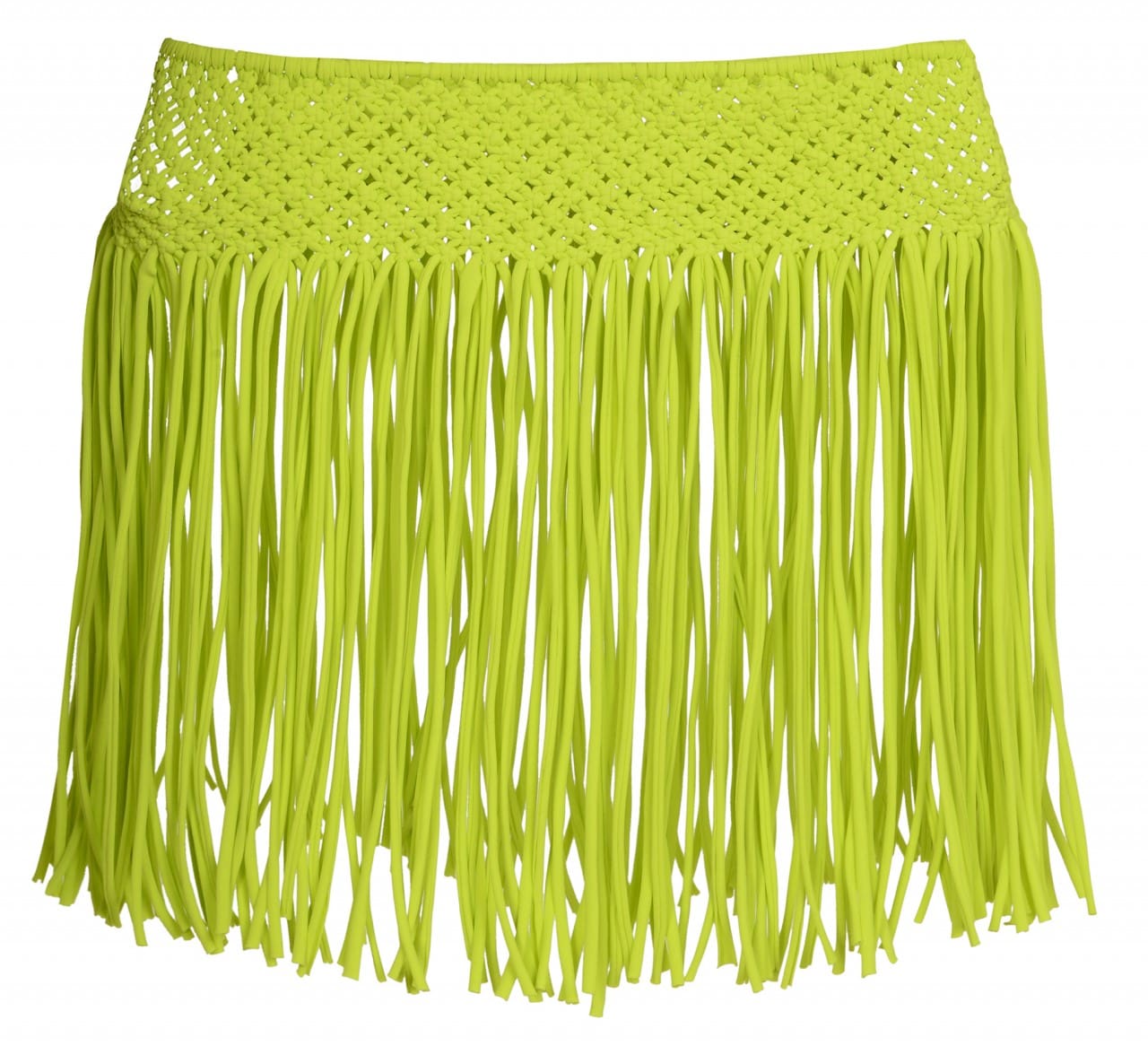 Bikinis and swimsuits feature cut-outs and audacious elastic straps and waist bands that flatter the figure, whereas fun print stand out on neoprene in a vast array of vibrant shades, including metallic foils in gold and silver. For the perfect cover-up, a sheer playsuit and macramé fringe skirts complete show-stopping swim ensembles.