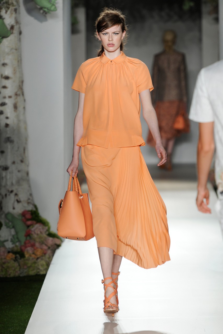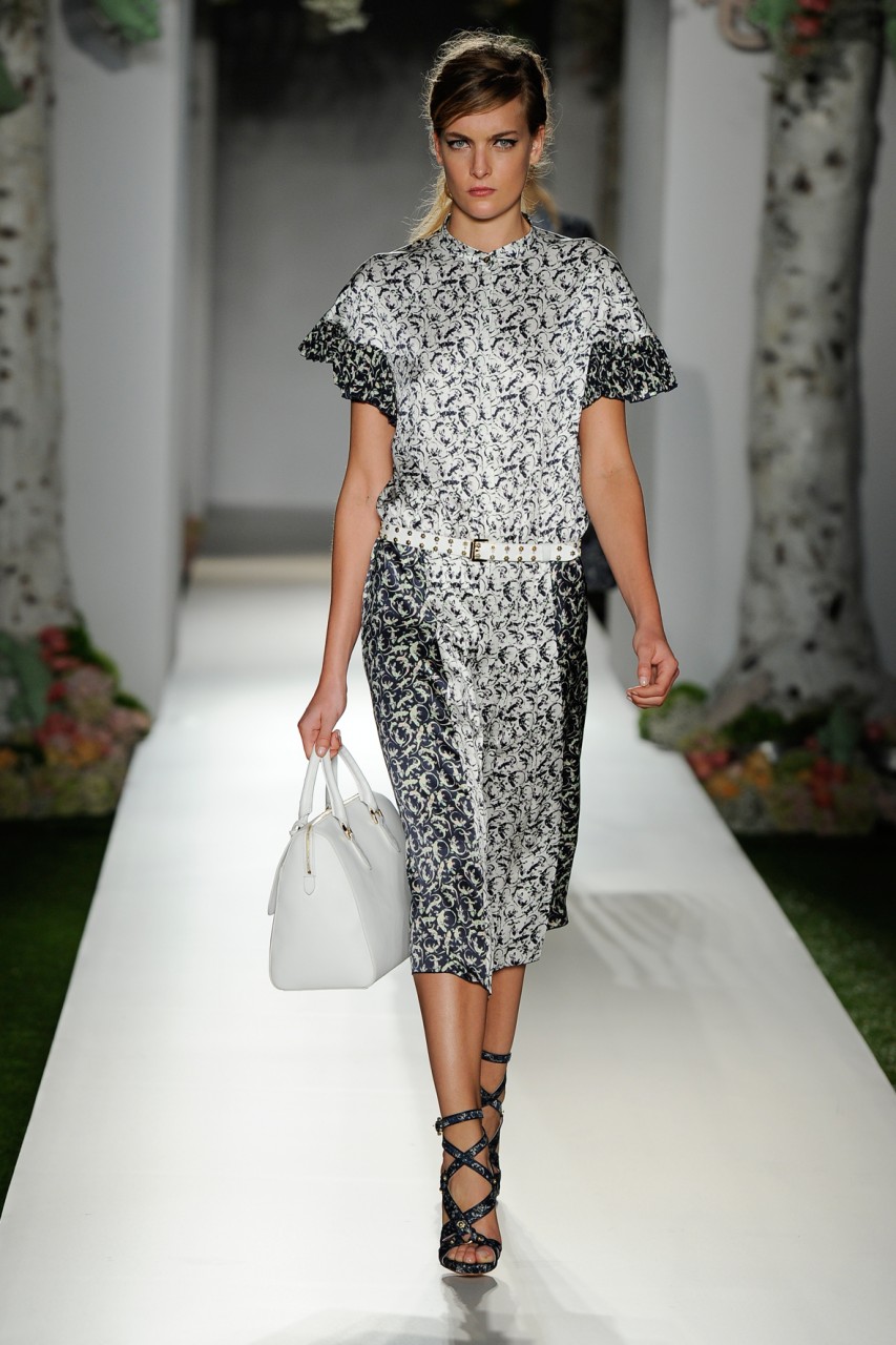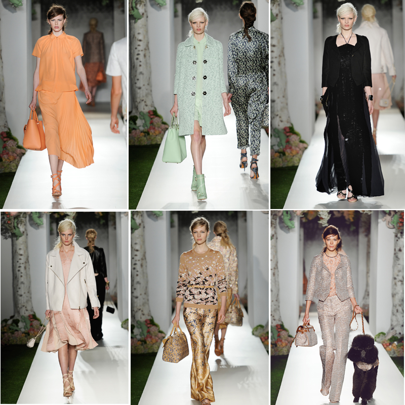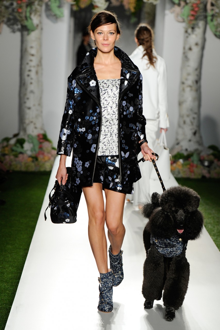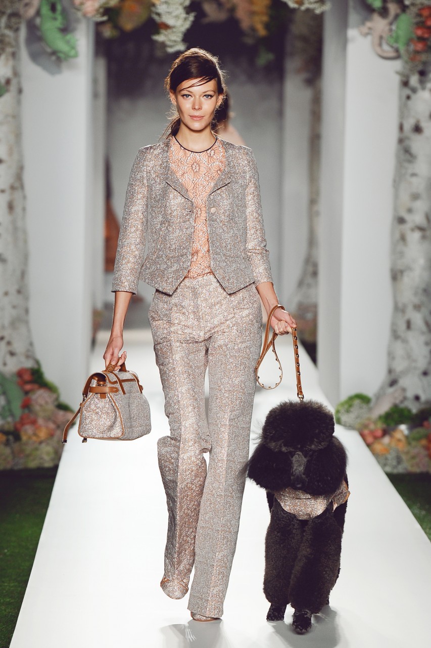 What we also noticed is that majority of the designs were clean cut on the top half, and then flowing through the bottom. Which we think is pretty elegant. Also… did you notice the poodle on the runway? That’s a completely different type of model that they brought out – but we think that the poodle as an accessory was pretty chic – it upped the game of Mulberry’s Spring/Summer 2013 collection.