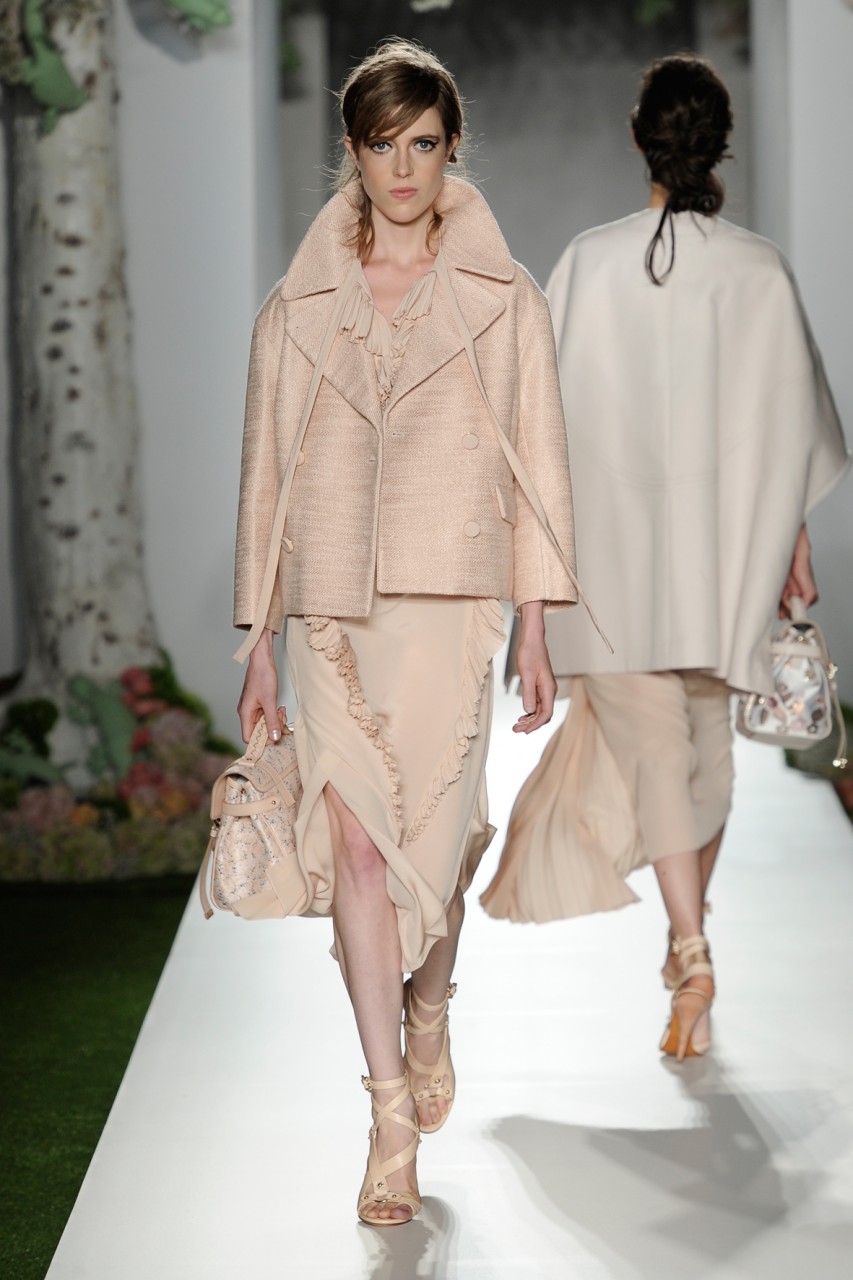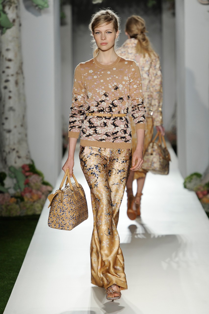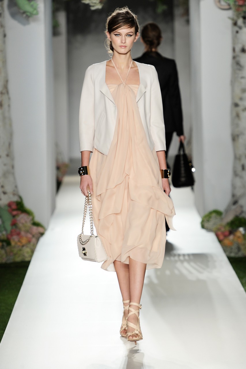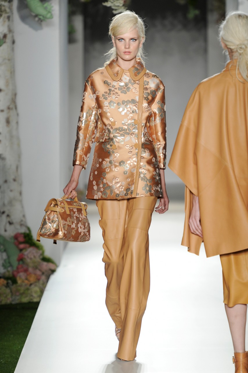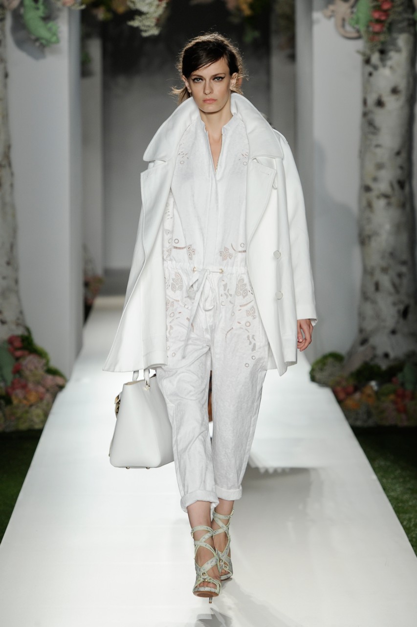 What we also noticed is that majority of the designs were clean cut on the top half, and then flowing through the bottom. Which we think is pretty elegant. Also… did you notice the poodle on the runway? That’s a completely different type of model that they brought out – but we think that the poodle as an accessory was pretty chic – it upped the game of Mulberry’s Spring/Summer 2013 collection.