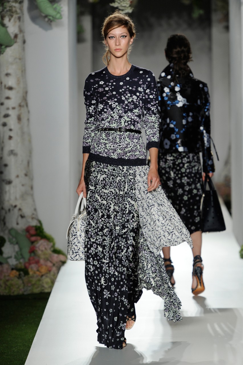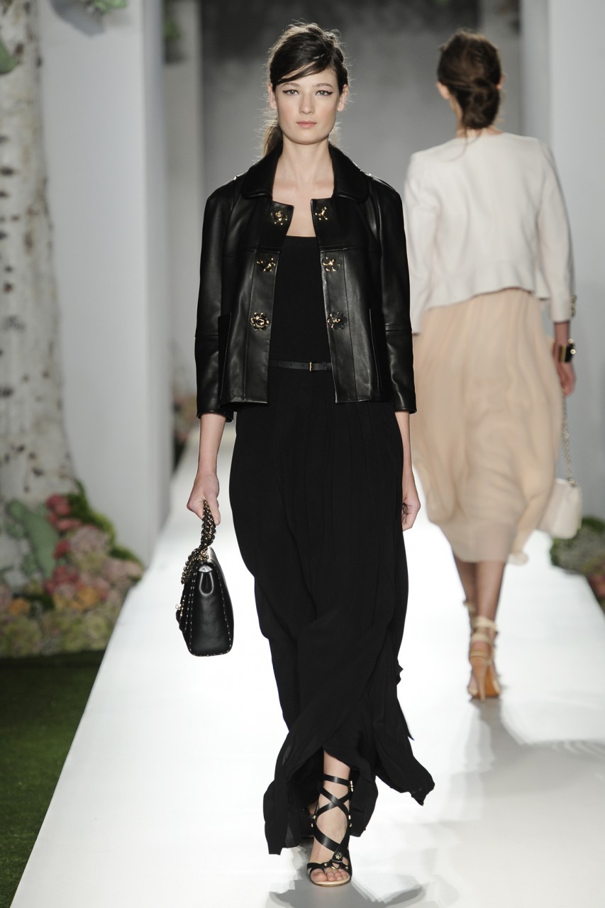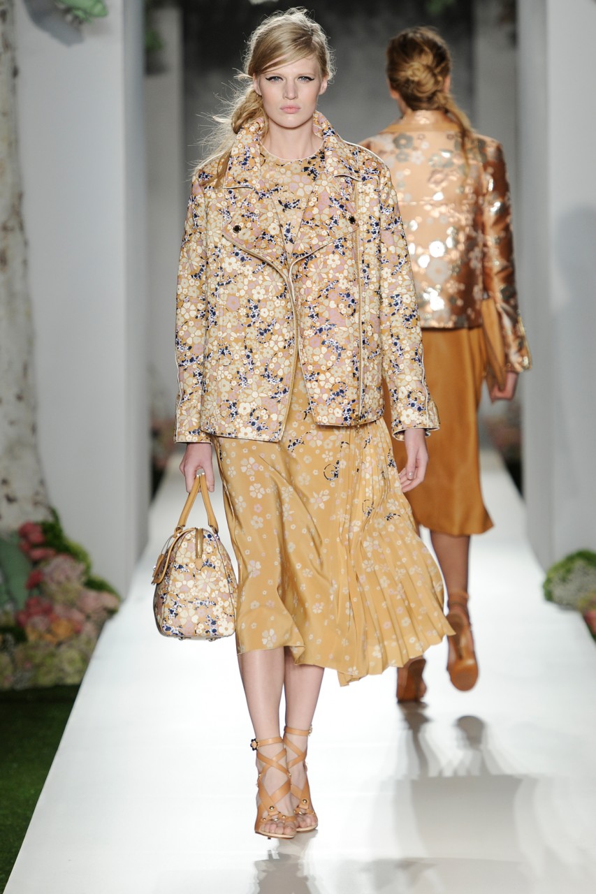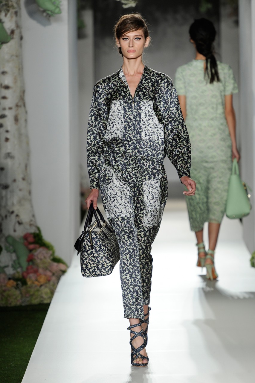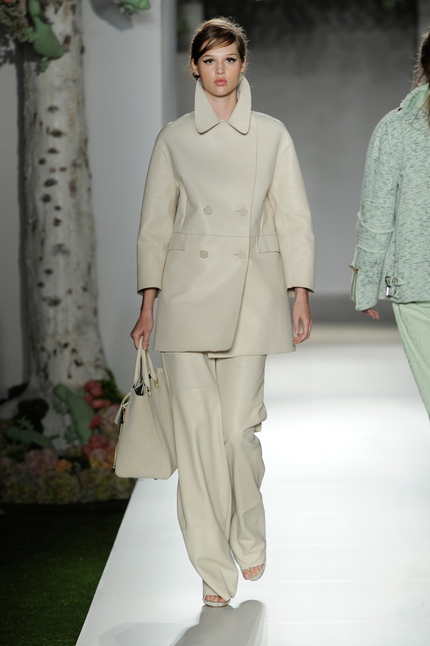 What we also noticed is that majority of the designs were clean cut on the top half, and then flowing through the bottom. Which we think is pretty elegant. Also… did you notice the poodle on the runway? That’s a completely different type of model that they brought out – but we think that the poodle as an accessory was pretty chic – it upped the game of Mulberry’s Spring/Summer 2013 collection.