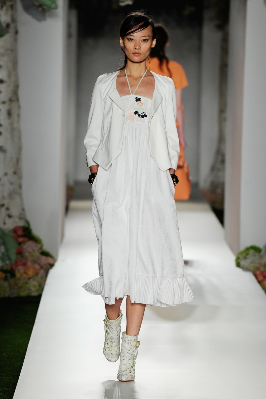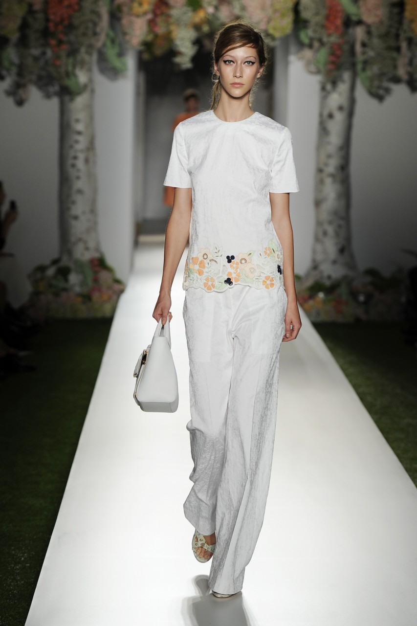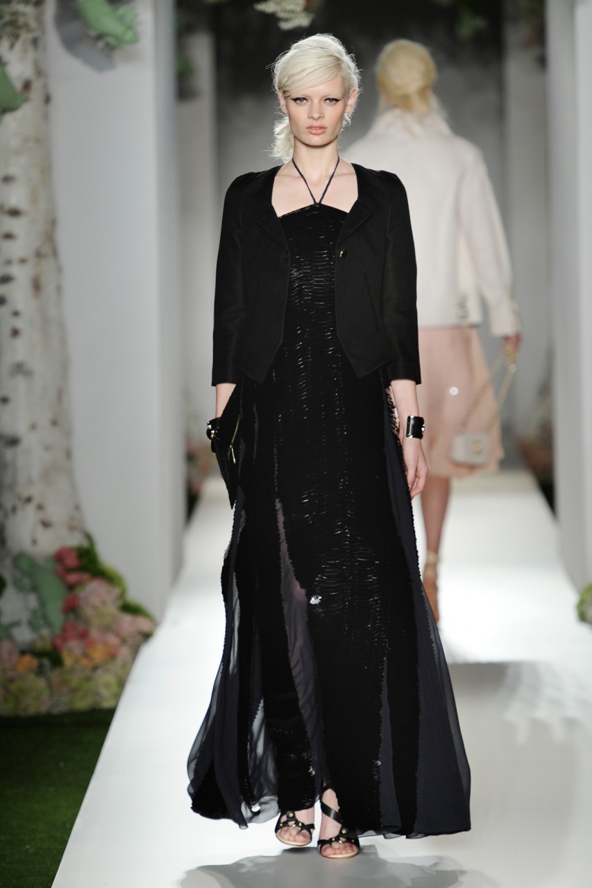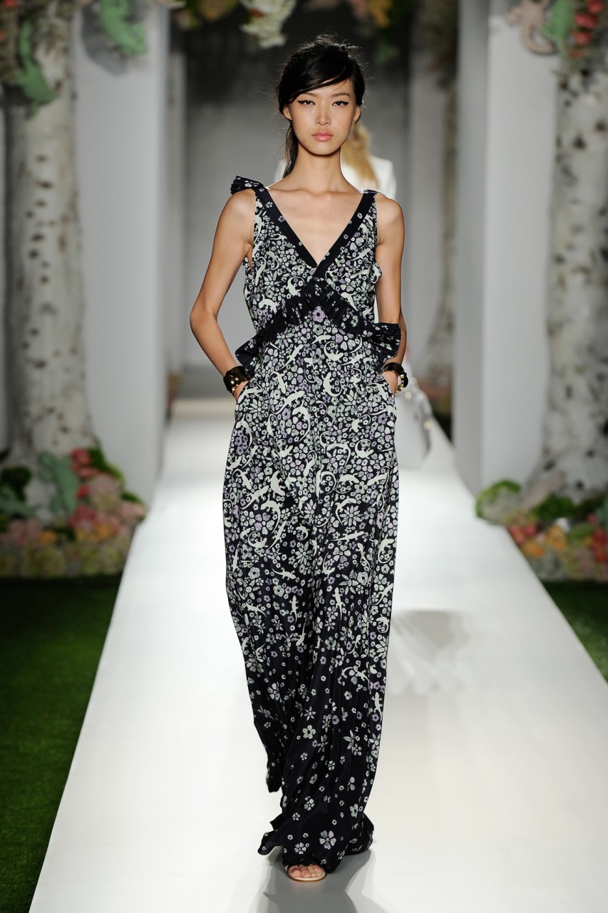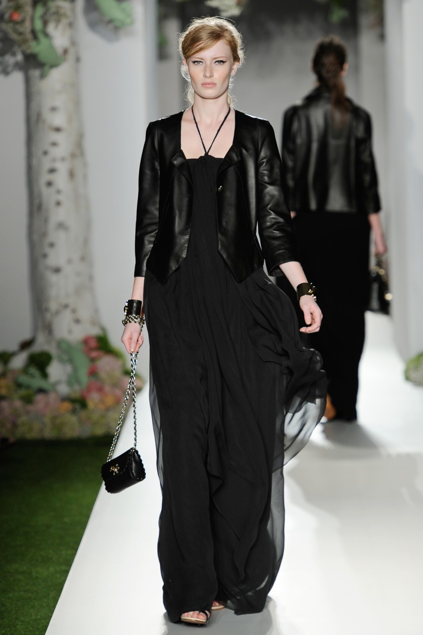 What we also noticed is that majority of the designs were clean cut on the top half, and then flowing through the bottom. Which we think is pretty elegant. Also… did you notice the poodle on the runway? That’s a completely different type of model that they brought out – but we think that the poodle as an accessory was pretty chic – it upped the game of Mulberry’s Spring/Summer 2013 collection.