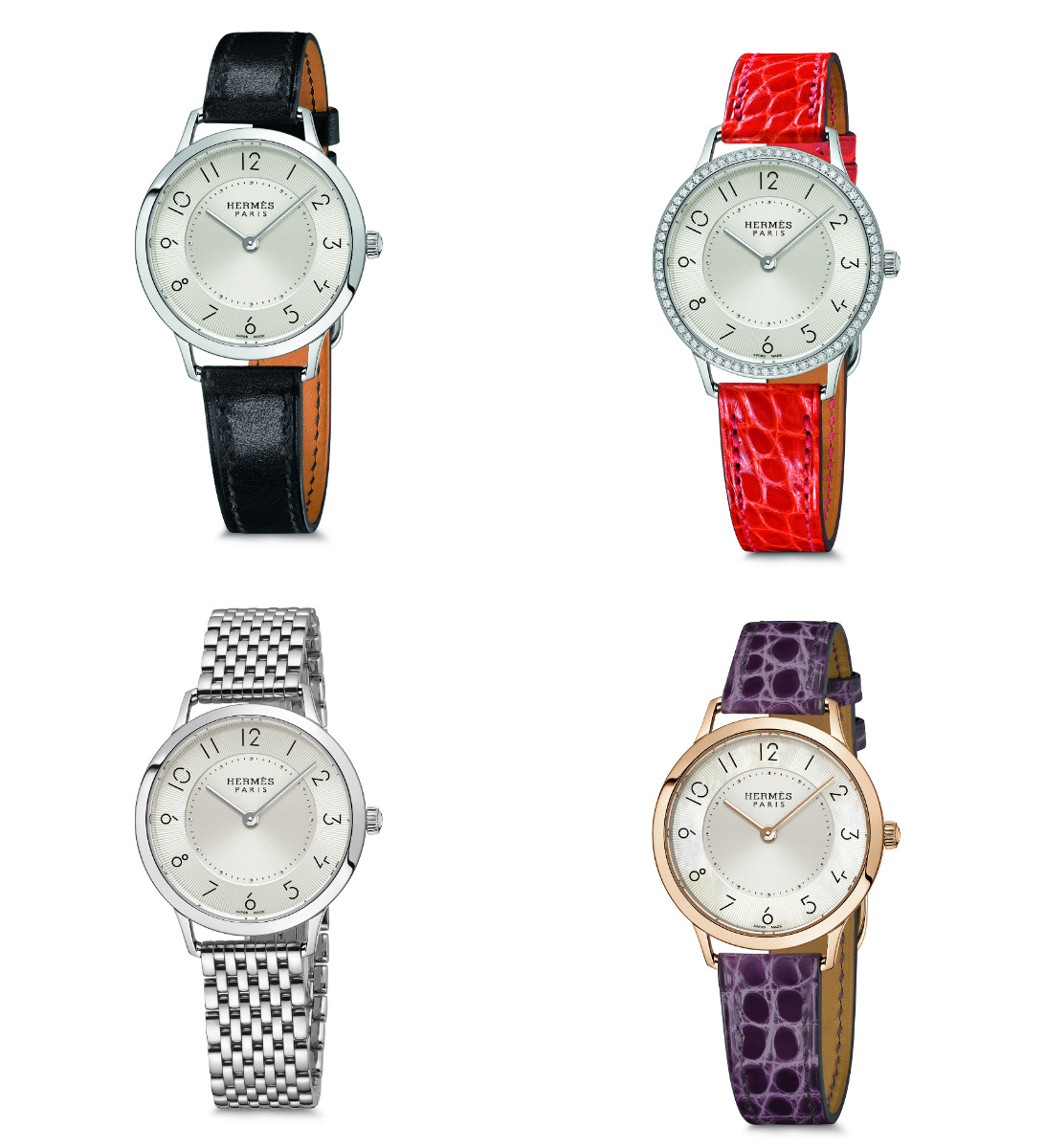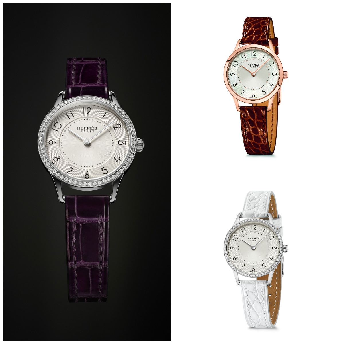 Perfect for everyday wear, the delicately designed alligator wristbands come in numerous gorgeous colours, such as blackcurrant, cloud white, sapphire blue, Etruscan, elephant grey, and ultraviolet. Other choices for the watch bands include box calf and Barenia leather. There are also steel and rose gold versions for the Slim d’Hermès collection, with the option of diamond settings. The rose gold is the true showcase of Hermès’ craftsmanship as it is decorated with a beautiful guillochè dial made of mother-of-pearl, and the back of the case even features Hermès’ ex-libris design.