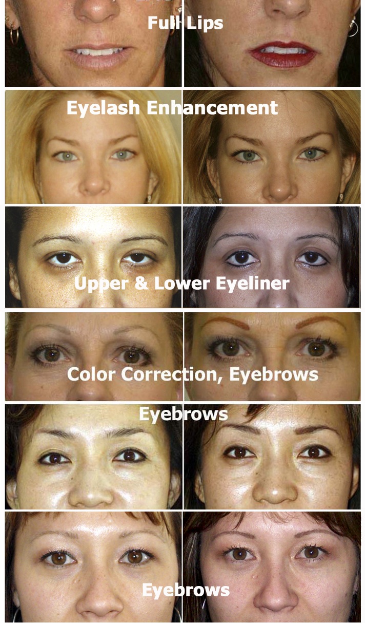 So what kind of permanent makeup procedures are there? You can have your eyebrows tattoed, have your lids lined and fuller lips, camouflaging your scars and beauty marks, lash enhancement and areola repigmentation.
