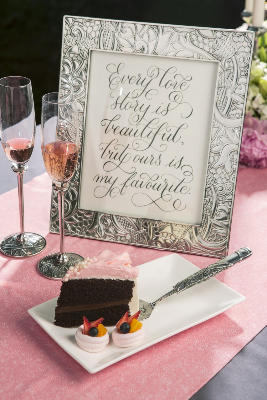Promessa means ‘promise’ in Italian, it looks just as delicate as it sounds with its intricate floral motifs on photo frames, a ring box, cake knife, cake server, document holder, photo album and champagne flutes fit for a wedding.